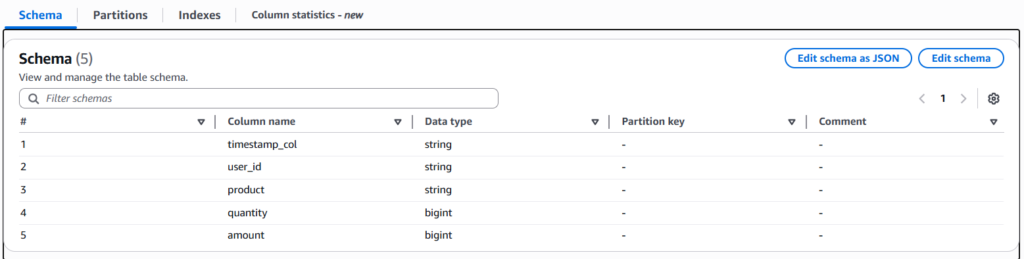 3. raw テーブルが作成され、timestamp_coluser_id などのカラムが正しく認識されていることを確認します。