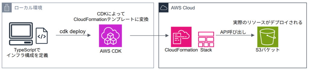今回のハンズオンでは、ローカル環境で作成したTypeScriptのコードをAWS CDKを使ってデプロイし、AWS上に「S3バケット」を1つ作成します。