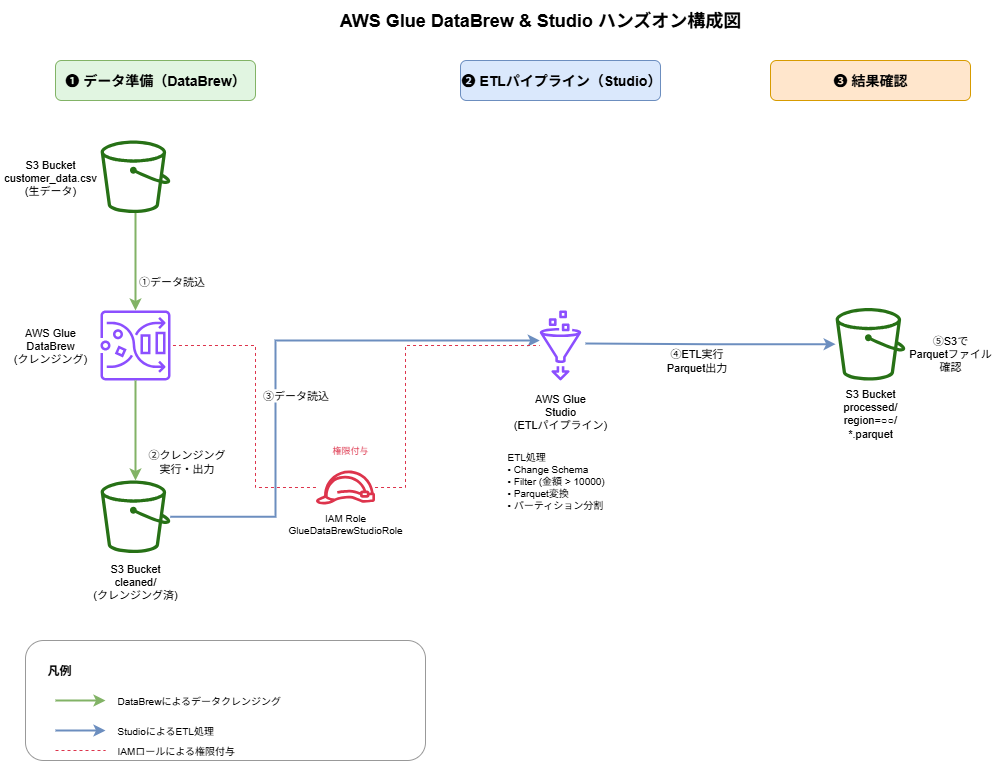 ・AWS Glue DataBrewとStudioがETLのどの部分を担っているかを理解し、ノーコード・ローコードでのETL処理の全体像を掴むこと
