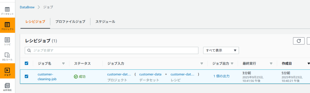7. 左タブの「ジョブ」を選択しcustomer-cleaning-jobが成功している事を確認