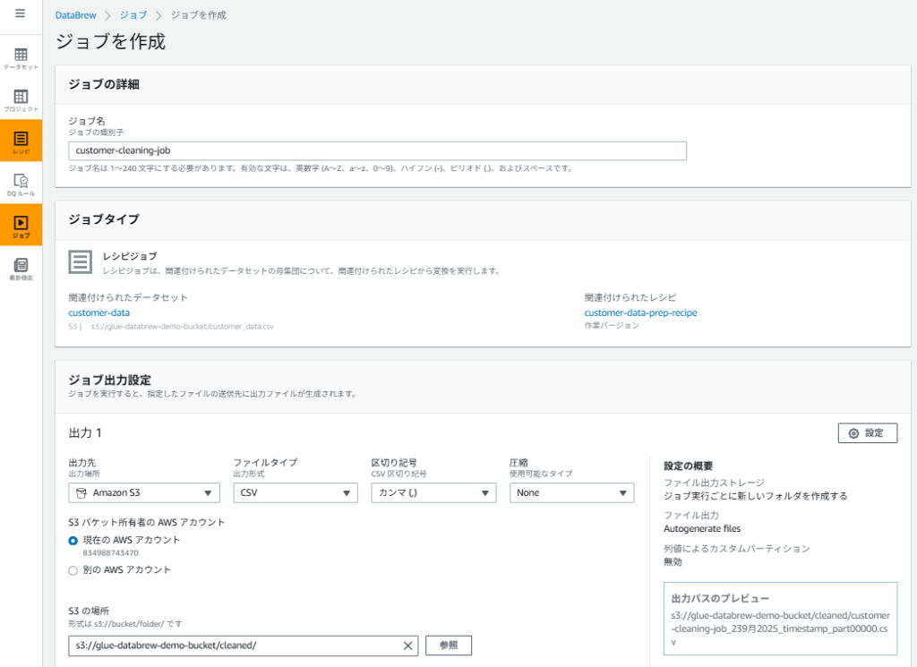 3. 出力先:s3://glue-databrew-demo-bucket/cleaned/