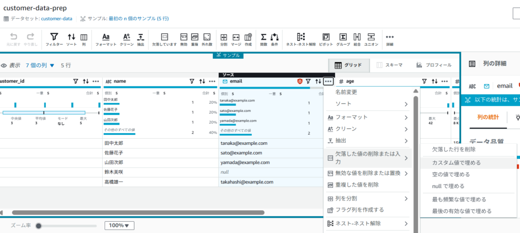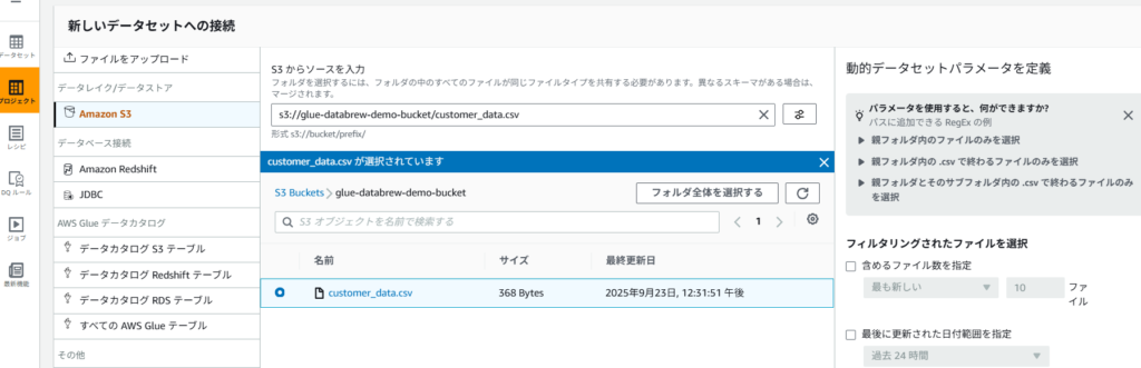 • データソース:s3://glue-databrew-demo-bucket/customer_data.csv