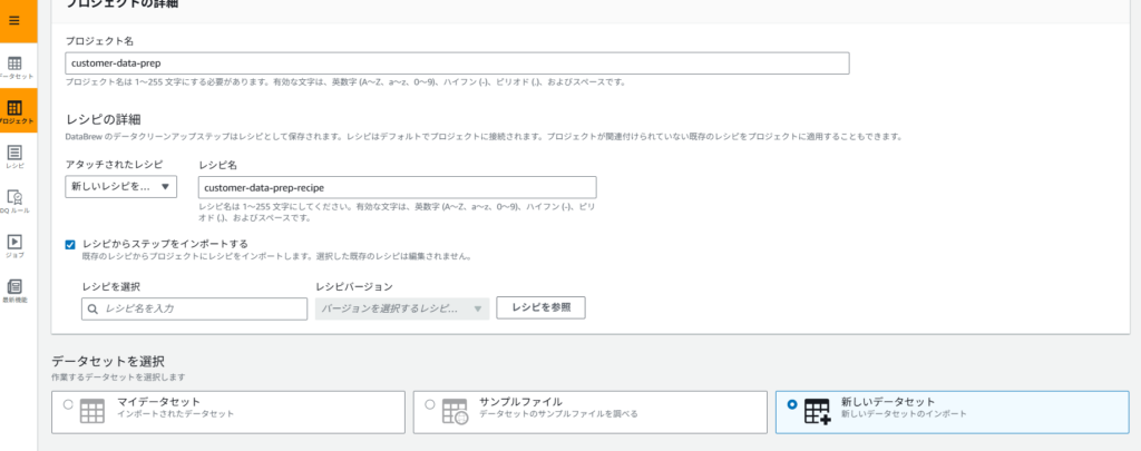 1. 検索窓から AWS Glue DataBrew → 左タブから「プロジェクト」→「プロジェクトを作成」