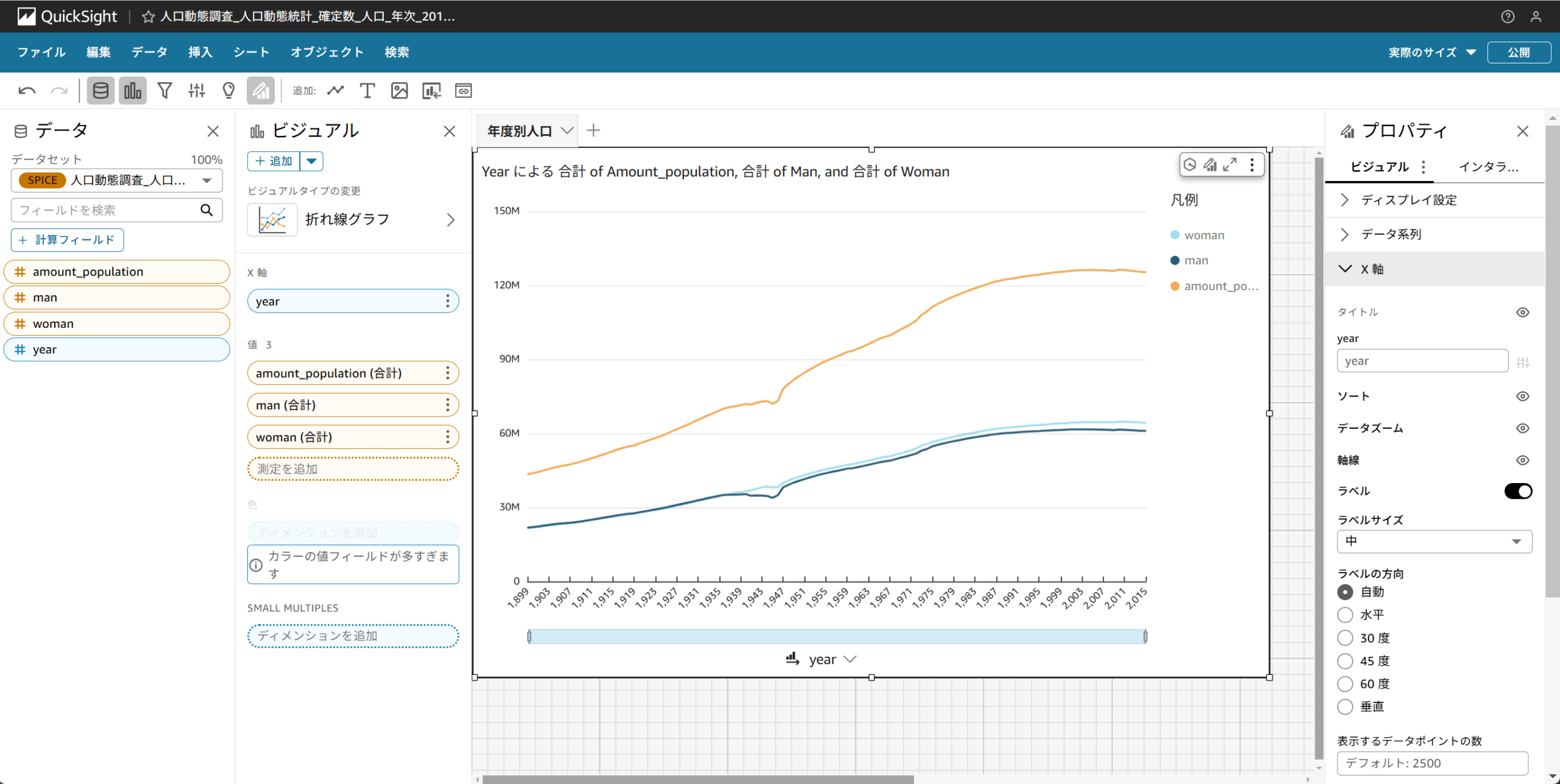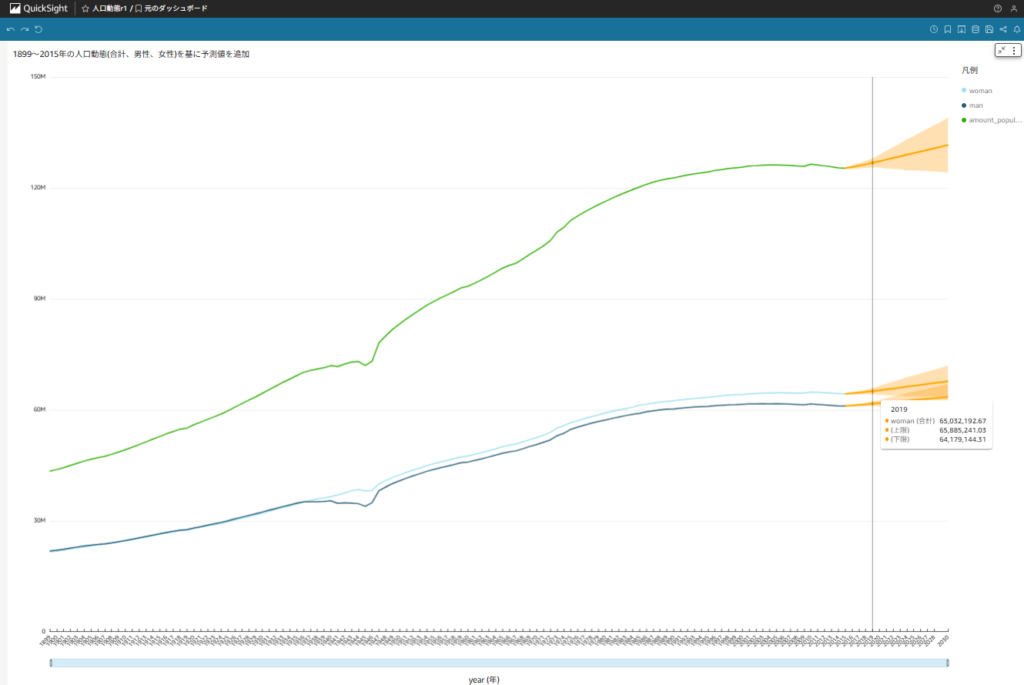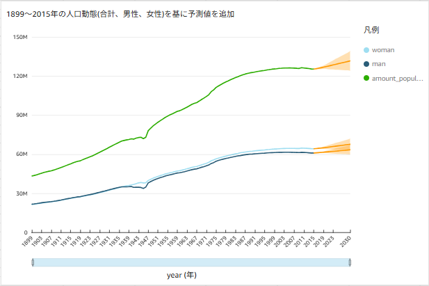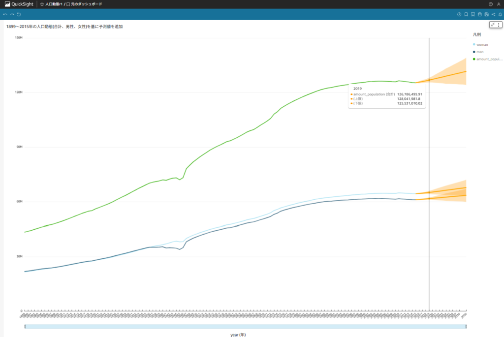 上記の結果を用いて、QuickSightのデフォルト機能となる予測機能を使用し、2030年までの人口動態を表したいと思います。