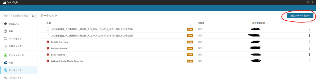 データセットを選択 > 左上の新しいデータセットを押下します。