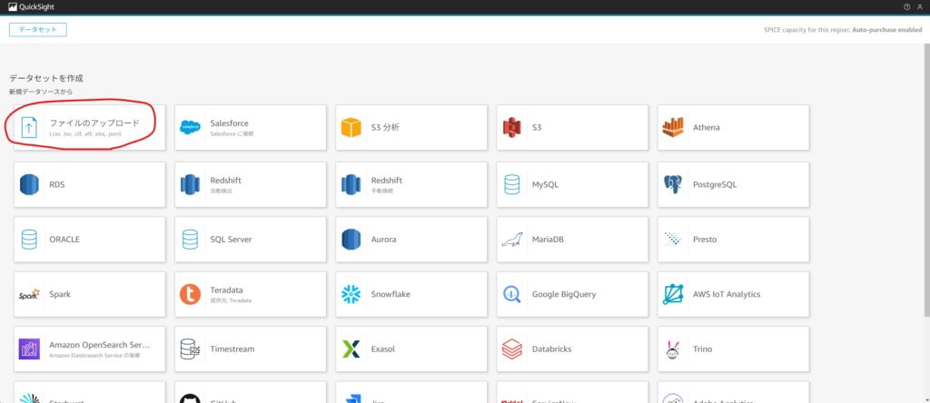 QuickSightよりデータ可視化を行うために、データの取込みを行います。