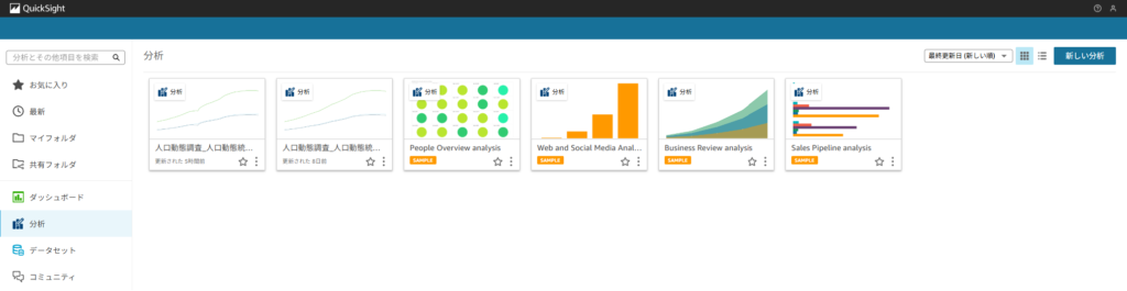 下記がデフォルトでオープンする画面となります。ここでは左カラム内の分析が選択されているため、現在取込み済みのデータが表示されています。ここではデフォルトで作成されているサンプル含め、6つの分析データが存在しています。