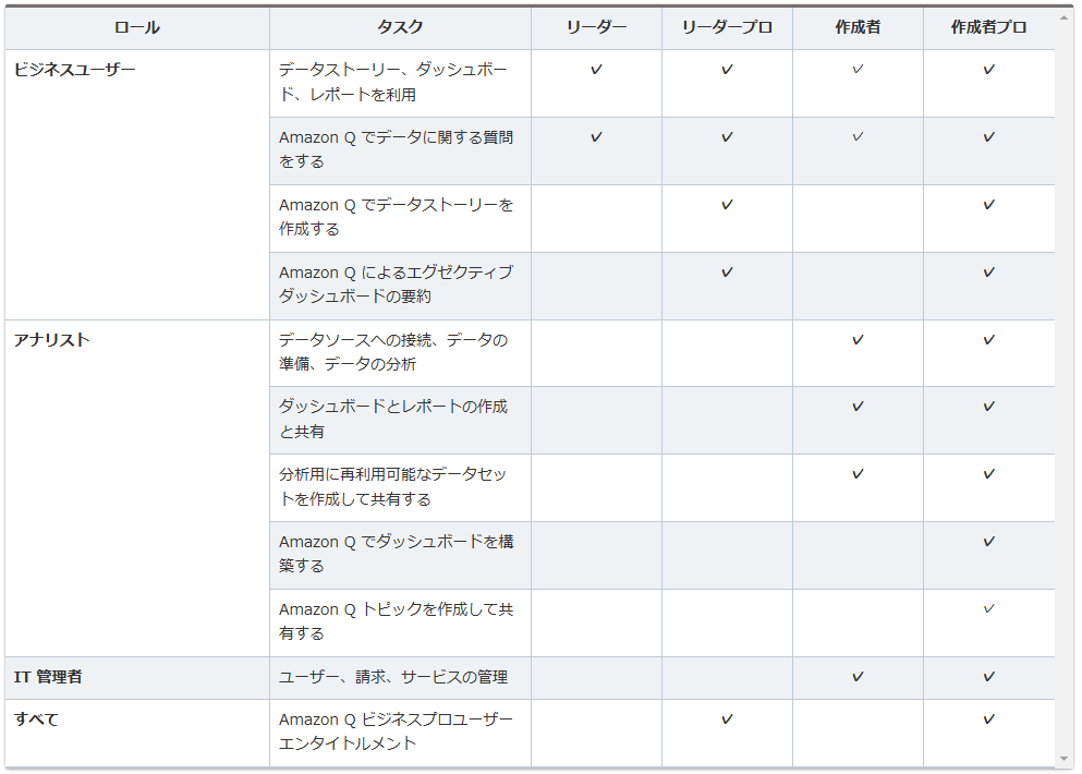 ※ Amazon Q トピックを持たないアカウントにおいて、少なくとも1名のProユーザーはアカウント毎に¥37,500/月のAmazon Q有効化料金が適用されます。 [AWSの料金](https://aws.amazon.com/jp/quicksight/pricing/?nc1=h_ls]