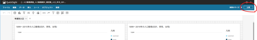 公開用のグラフが揃ったところで、右上の公開を押下し、結果をダッシュボードに追加することができます。