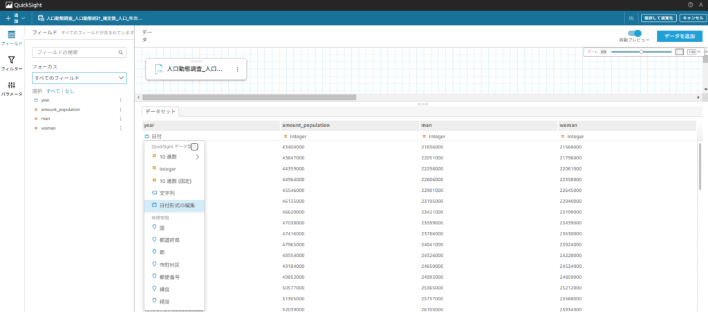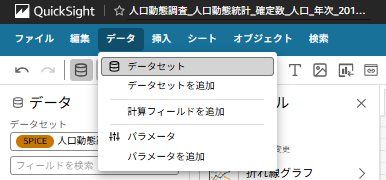次項からは実際にQuicksightを用いて、オープンデータ(e-govポータル)における2015年の人口動態データの可視化、及びQuickSight標準機能である予測機能を用いて実測値と予測結果を比較したいと思います。
