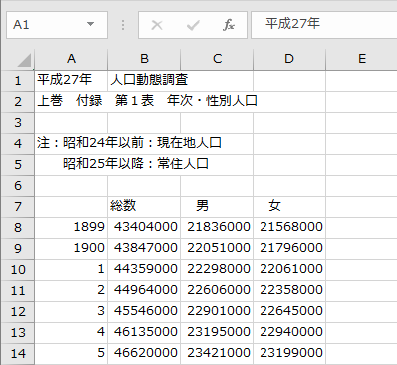 下記がデータ取込み後の折れ線グラフにて可視化した1899~2015年の人口動態となります。