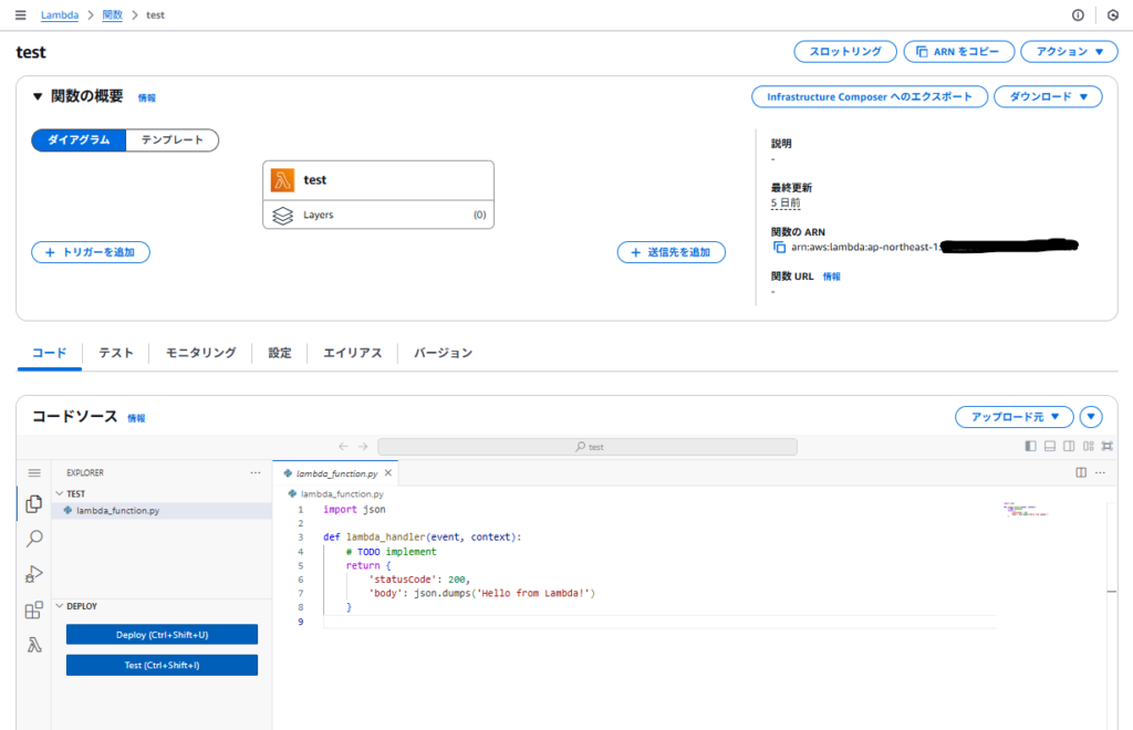 作成完了後、Lambdaの初回起動時の画面は下記となります。