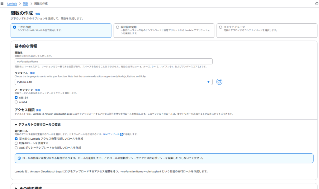 AWSマネジメントコンソールより、Lamdda > 関数を作成、を選択します。