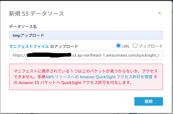 また、このまま接続検証を行うと、下記画像のようにアクセス拒否されるため、管理画面から該当S3バケットのアクセス許可を行います。