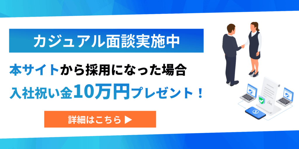 現在、弊社サイトから採用された方に、入社祝い金10万円をプレゼントしております。